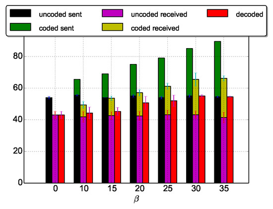 In wireless network communications, faulty equipment, congested routers, collisions, interferences, etc. can lead to a partial or complete loss of packets. Conventional wireless communications deploy reliability improving techniques such as full data replication or on-demand retransmission. These techniques are too expensive or even not possible due to very strict energy constraints and asymmetric wireless channels. Erasure Codes (EC) allow to enhance the reliability of data transmissions by transmitting redundant data [16,17,18,19]. Applying such methods in WSNs faces the challenge of supporting more or less complex methods for tiny sensors. A tradeoff between (i) reliability achieved, (ii) energy, and (iii) delay overhead is investigated in [16]. The result is that ECs improve the communication reliability considerably with a small delays increase. The same conclusion is proved by our experiments (see Section 5.7).