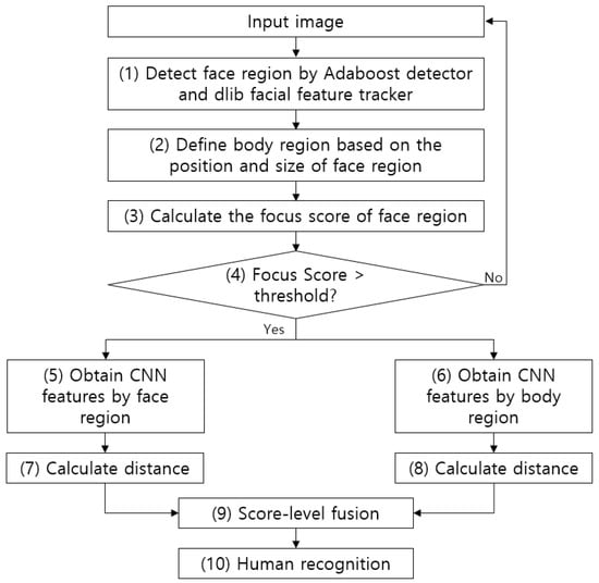 Figure 1 shows an overall flowchart of the proposed method. First, the face region in an image captured by a surveillance camera is detected by the adaptive boosting (AdaBoost) detector []. Then, a more accurate face region is detected based on the positions of the facial features (both eyes) detected by the dlib facial feature tracker [] (step (1) in Figure 1). After this, the body region is defined based on the position and size of the detected face region (step (2) in Figure 1). In the next step, the face region’s focus score is measured and the next recognition step is only performed if this value is above a certain threshold (steps (3) and (4) in Figure 1). If it is not, the next image is acquired from the camera. After this, the CNN models are run using the face region and body region as separate inputs (steps (5) and (6) in Figure 1). The extracted CNN features are used to measure their distance from the already registered features (steps (7) and (8) in Figure 1). Score-level fusion is performed using the two obtained distances, and a final matching score is obtained. This is then used to perform human recognition (steps (9) and (10) in Figure 1).