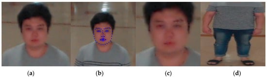 As explained in Section 4.1 and shown in Figure 2, the AdaBoost detector is used to detect the face region in an image captured by a camera []. AdaBoost detector uses the cascaded weak classifiers based on Haar feature, and it has been widely used for face detection. In this research, we used the AdaBoost detector provided from OpenCV library [] without additional training with our experimental images. AdaBoost detector can generate the roughly detected face box which includes face and the part of background. Therefore, a more accurate face region is detected based on the positions of facial features (both eyes) detected by the dlib facial feature tracker []. In this research, we used the open source of dlib facial feature tracker provided from [] without additional training with our experimental images. Also, as explained in Section 4.1, the body region is defined based on the size and position of the detected face region and anthropometric data on a normal person’s body, as shown in Figure 2d. In details, based on the center position (x_face, y_face), width (w_face), and height (h_face) of the detected face region, the center position (x_face, y_face + 1.8 × h_face), width (1.8 × w_face), and height (2.2 × h_face) of body box are defined, respectively. The lowest vertical position of body box is limited by “image height—1”. In addition, the left- and right-most positions of body box are limited by “0” and “image width—1”, respectively.