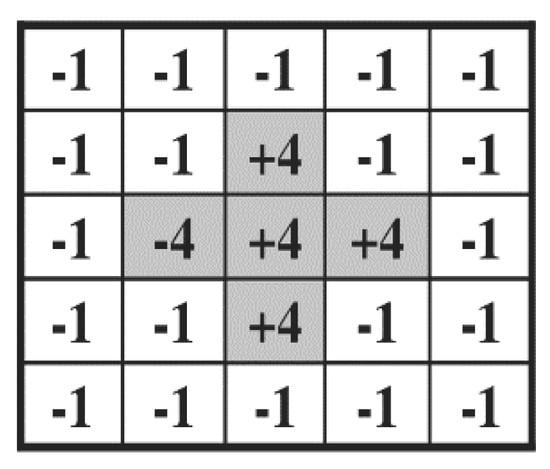 After this, the 5 × 5 mask proposed in [] is used on the face region to calculate the focus score. The shape of this mask is shown in Figure 3. The 5 × 5 mask was designed to measure the amount of high frequency component in image []. In details, the magnitude value is computed by the convolution operation with the 5 × 5 convolution kernel in the image based on the moving step of 1 pixel both in horizontal and vertical directions as shown in Equations (1) and (2). Then, this magnitude value (FS of Equation (2)) is normalized so as to be presented in the range from 0 to 100 based on min-max scaling, and min and max values were determined from the training data. This normalized value is used as final focus score, and the higher the score, the better the focus condition. The next recognition step is only performed if this focus score is above a certain threshold. If it is not, the next image is acquired from the camera instead of recognition. The optimal threshold of focus score was experimentally determined as 20 (both in DFB-DB1 and ChokePoint databases) from the training data so as to obtain the highest accuracy of recognition.
