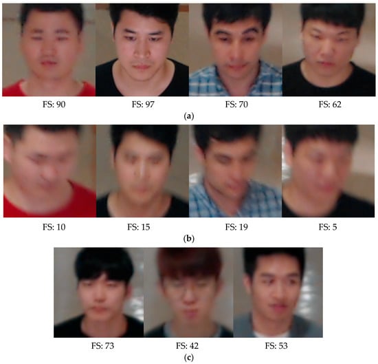 In Equations (1) and (2), , and are input, output, and 5 × 5 mask images, respectively. W and H are the image width and height, respectively. In the DFB-DB1 database, which was custom made for this study, images were captured by two types of cameras, namely, the Logitech BCC950 [] and the Logitech C920 [], to evaluate performance of the proposed method in a variety of camera environments. Figure 4 shows the focus scores of images in DFB-DB1. Also, Figure 5 shows the focus scores of the ChokePoint dataset [], which is an open database used in this study. As seen by a comparison of Figure 4b and Figure 5b, the blurring due to user movement is more severe in the images in Figure 4b.