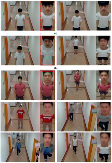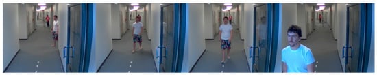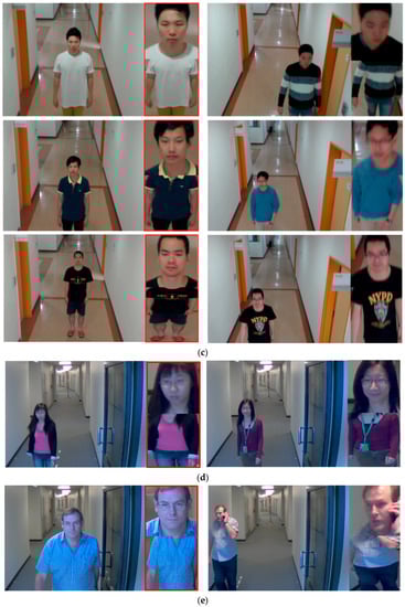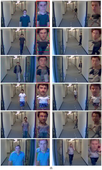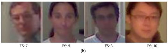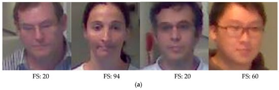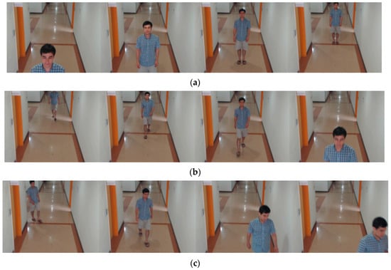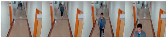 The ChokePoint database is a real-world surveillance video database which was designed for person identification and verification experiments and is provided by National ICT Australia Ltd. (NICTA) as an open database []. It consists of Portals 1 and 2. Portal 1 contains images of 25 people (19 males and 6 females), and Portal 2 contains images of 29 people (23 males and six females). Portals 1 and 2 were captured during a one-month time span. The images for each location were captured with three cameras, and at a total of six locations. In this study, the location P2L was selected from among the six locations as it is similar to the location in the DFB-DB images. As previously mentioned, the P2L database contains images of a total of 29 people. In this study 28 people were selected for two-fold cross validation. Fourteen classes were set for each of the sub-databases 1 and 2. Examples from the ChokePoint database are shown in Figure 11, and descriptions of the ChokePoint database are provided in Table 4.