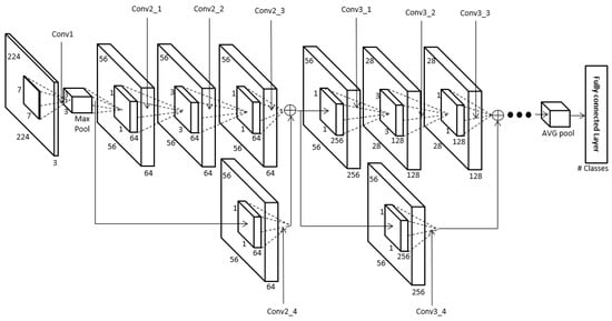 The structure of ResNet-50 []. Conv, MaxPool, and AVG pool represent convolutional layer, max pooling layer, and average pooling layer, respectively.
