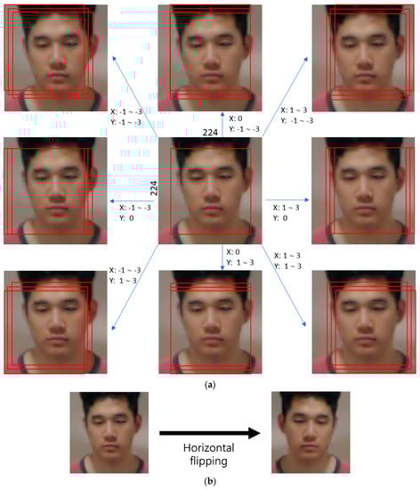 In DFB-DB1, the number of images for each class (person) is different, so when augmentation was performed, classes with over 100 images underwent a process of 3-pixel left/right/top/bottom image translation and cropping as well as horizontal flipping (mirroring) (refer to Figure 12), while classes with less than 100 images underwent a process of 5-pixel left/right/top/bottom image translation and cropping as well as horizontal flipping. Sub-databases 1 and 2 from Table 4 were combined to obtain around 600,000 augmented images. In the ChokePoint dataset, unlike DFB-DB1, there were many images for each class, so image translation and cropping was performed at 2-pixel increments in the upper-left direction and 2-pixel increments in the lower-right direction to increase the number of images by a factor of 25. In addition, a horizontal flipping process was performed to increase the number of images by a factor of 50. Sub-databases 1 and 2 from Table 4 were combined to obtain around 740,000 augmented images. This data augmentation method has been used many times in previous studies [].