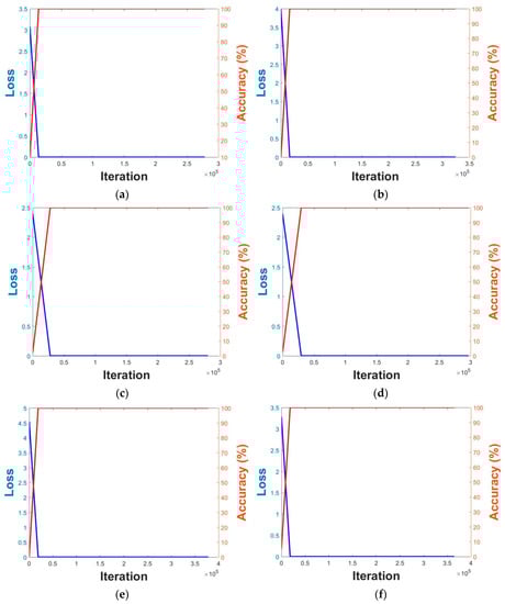 Using the augmented data, fine-tuning was performed on pre-trained VGG Face-16 and ResNet-50 models using the SGD method. As explained in Section 4.5, unlike the GD method, in the SGD method, the number of training sets divided by mini-batch size is defined as an iteration, and one epoch is set when training is performed for all the iterations. In this study, the momentum, weight decay, and learning rate during training were set at 0.9, 5 × 10−4, and 1 × 10−5, respectively, and the batch size was 20. Training with DFB-DB1 was performed for 20 epochs, and training with the ChokePoint database was performed for 15 epochs. Because the number of images in the ChokePoint database is larger than that in DFB-DB1 as shown in Table 4, CNN training with the ChokePoint database was performed by the smaller number of epochs than that in DFB-DB1 considering the limitation of graphic processing unit (GPU) memory. Figure 13 shows the training loss and accuracy during the 1st and 2nd validations using DFB-DB1 and the ChokePoint databases. The x axis shows the number of iterations, while the left-side of the y axis shows the loss value and the right-side of the y axis shows the training accuracy. As seen in Figure 13, the training loss was close to 0%, and the training accuracy was close to 100% in all cases. This indicates that the VGG Face-16 and ResNet-50 models used in this study were sufficiently trained. Experimental results showed that it took two or three days for training one model in each fold.