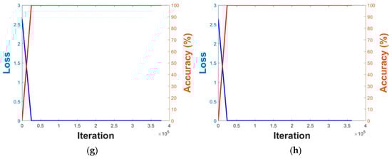Graphs of training loss and accuracy on DFB-DB1 (a–d) and ChokePoint datasets (e–h). VGG Face-16 in case of (a,e) the 1st validation, (b,f) the 2nd validation. ResNet-50 in case of (c,g) the 1st validation, (d,h) the 2nd validation. Red and blue lines show the training accuracy and loss, respectively.