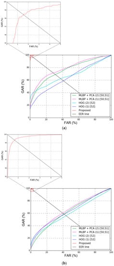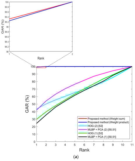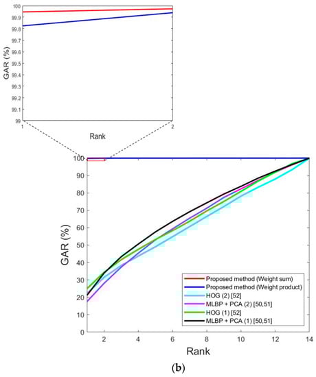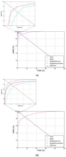 Figure 14 shows the receiver operating characteristic (ROC) curves [] of the results of Table 7 and Table 8. Here, the genuine acceptance rate (GAR) is defined as 100-FRR (%). As previously mentioned, the experiments in this study were performed with two-fold cross validation, and the average graph of the ROC curve obtained from testing two times is shown. In Figure 14, it can be seen that the weighted sum method showed higher accuracy than the weighted product method in both databases, and it showed higher accuracy than single modality-based recognition of the face and body without score-level fusion.