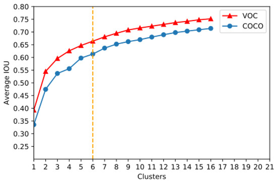 Considering the model complexity and high recall, is adopted as a good tradeoff for further computing (Figure 2). Normally, the Euclidean distance is used to denote the distance between an element and the cluster center in the clustering algorithm. Note that the objects are of different sizes; the Euclidean distance cannot exactly reflect the object location in the image. We shall thus use a more appropriate form to demonstrate the distance, which is shown in Equation (14):