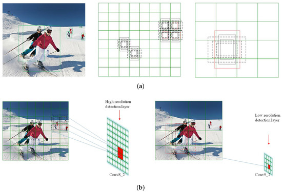 Object capturing on real images is both laborious and time-consuming. The single-shot detector (SSD), which significantly outperforms other methods, combines the standard architecture and the auxiliary structure for high quality image classification. For each feature layer of size , SSD assigns default boxes of different scales to every single cell. However, the bounding boxes cannot always accurately detect the object. The box in the red solid line is the specific ground truth. As depicted by an example in Figure 4a, for objects of different sizes, default boxes of high-resolution from SSD fail to cover the targets, which in turn increase the computing amount. Meanwhile, in the layers of low resolution, objects are missed because the boxes are too large. To best fit a specific layer, the resolution largely affects the number of boxes: for a high-resolution cell the default boxes are redundant while for a low-resolution one, more boxes need to be stacked and revise the prior boxes into slender shapes handled carefully. Note that the prior boxes are assigned due to the clustering results; the total number of boxes decrease with the overlapping ratio increases in Figure 4b.