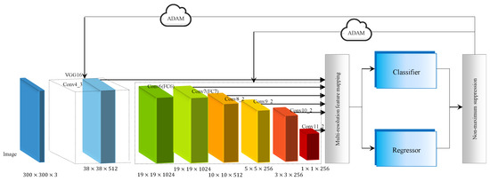 The model architecture is shown in Figure 5. EAO is initiated with standard VGG 16 as base network, which is a classical network for feature mapping [44]. Instead of using max-pooling, we employ the stochastic-pooling algorithm to address the issue of overfitting [45]. The multi-resolution detection layers are then integrated to seed the detection algorithm. The feature mapping is on the foundation of activation function Rectified Linear Unit (ReLU) to prevent gradient disappearance and results in faster learning [46]. By using the classical VGG 16 version, the basic layer conv4_3 is kept and the two fully connected layers, FC6 and FC7 are converted into typical convolution layers [47]. The latter is utilized as the detection layer. As a result, the network is deployed by multiple feature maps, whose sizes are , , , , and . The convolutional layers decrease in size progressively. In each detection layer, a convolution is applied to extract the feature of prior boxes. At each feature map cell, the offsets relative to the ground-truth box in the cell, as well as the conditional probabilities of the object category are picked. For a given cell with k prior boxes, we focus here on the four offsets involved with the ground-truth box. These layers are followed by a softmax classifier and a linear regressor, which predicts the category of the prior box and calculates the offset between the prior box and ground-truth box, respectively. Final detections are produced through non-maximum suppression step. Within the model, the random optimizer ADAM is taken for end-to-end training optimization.