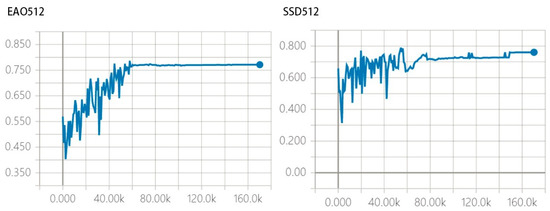 According to the testing outcome, our model trained with input , which keeps the same aspect ratio with SSD300, is of a higher accuracy ( vs. for SSD300). Our results denote EAO outperforms SSD when improving the original input size to . A is gained and the recall reaches 85–90%. In contrast with R-CNN, EAO is particularly effective due to the classifier and the regressor. To further assess the property of EAO from different resolution, we record the working process by employing analysis tool Tensorboard provided by Google tensorflow. With the multi-resolution network applied, a higher IOU can be obtained. Compared to SSD, EAO is highlighted with the convergence speed and the detection accuracy, which is expressed in Figure 6.