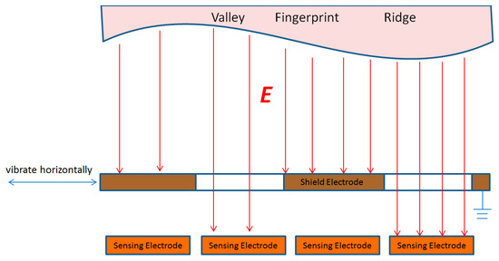 The MEMS structure of the electrostatic fingerprint sensor is composed of a metal grid-shaped shield electrode, a square sensing electrode matrix, and a comb-shaped driving electrode. As shown in Figure 5.