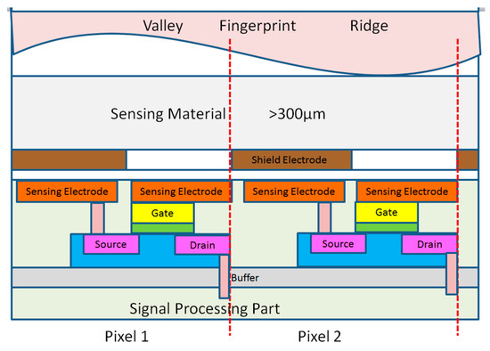 In recent years, with the continuous upgrading of smartphones and the increasing demand for online and mobile payments, biometric-based personal identification technology has the advantages of convenience and security [1,2]. Commonly used biometric methods include fingerprint recognition [3,4,5,6], iris recognition, and facial recognition [3,4]. Among them, fingerprint recognition is the most widely used biometric identification method. There are various ways to obtain fingerprints, including optical, temperature, pressure, acoustic, and capacitive methods. The optical fingerprint sensor captures a fingerprint image through the lens and can penetrate thicker glass. Synopsys’ optical fingerprint sensor can be placed at the bottom of the screen, independent of the thickness of the glass, but at a higher cost and with limited security, it can be deceived by fingerprint images [3]. A fingerprint sensor based on thermal detection uses a thermoelectric material to measure the amount of heat transferred from the sensor to the fingerprint to obtain a fingerprint image [3]. The pressure type fingerprint sensor is based on the piezoelectric effect. When the finger is placed on the top surface of the sensor, only the ridge is in contact with each sensor unit. Ultrasonic fingerprint sensors use the principle of medical ultrasound to create a visual image of the fingerprint with deep penetration [5,6]. Qualcomm’s ultrasonic fingerprint sensor can also be placed at the bottom of the screen, with a penetration capability of 700–800 μm, but at a higher cost, it is currently only available on the latest flagship phones [5]. Capacitive fingerprint sensors obtain fingerprint images by measuring the difference in capacitance between the fingerprint ridges and valleys and the sensor [7,8,9,10,11,12]. At present, the most widely used fingerprint identification tool is a capacitive sensor because it is low in cost and small in size, and it is convenient to be deployed in the system. Capacitive fingerprint sensing achieves fingerprint pattern recognition by sensing changes in capacitance caused by different distances of the ridges and valleys on the sensor surface [10,13,14,15]. Existing capacitive fingerprint sensors require high mechanical durability due to their mounting on mobile devices and their high touch operating frequency. However, due to the detection distance limitation (<250 μm) of the existing capacitive fingerprint sensor, the thickness of the protective coating of most of the current sensor-sensitive surfaces is limited to 50–100 μm [10]. Scratches and abrasion can be generated because of its thinness and insufficient coating hardness. If the fingerprint recognition distance can be effectively improved, a thicker protective coating or a certain thickness of the glass protective layer can be used to improve the life of the fingerprint sensor.