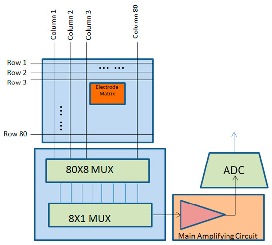 The signal processing part of the sensor is divided into four parts: IV conversion, channel selection, the main amplification circuit, and AD conversion. Each electrode signal output is performed in order, as shown in the figure. The IV conversion section uses the FET as the first stage for converting the induced current signal on the electrode into a voltage signal, and then channel selection is performed using the multi-channel data selector through row and column selection. A pair of electrode signals are selected from 80 × 80 electrodes to enter the main amplifying circuit for amplification. Then, a digital-to-analog conversion is performed by the AD circuit and, finally, the output is performed in order. The data selection section is shown in Figure 6.