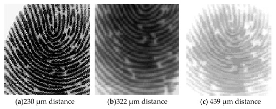 We used a prototype sensor to collect 50 fingerprint images at different distances for analysis. A sensing result is shown in Figure 9. Figure 9a shows the result of the sensor covered with the no. 2 coverslip. Its thickness is 213 μm. The fingerprint is 230 μm from the sensor plane and the image is very clear.