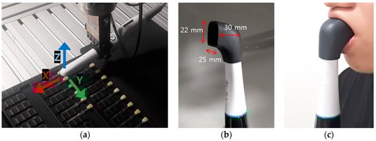 To eliminate color errors caused by environmental conditions, a robot arm (LBR iiwa 7 R800, KUKA, Siegen, Germany) with position repeatability of ±0.1 mm was used and a specially designed jig was used to fix the position of the 26 shade tabs of the 3D as shown in Figure 2a. Figure 2b shows a cap equipped on the head of the device to eliminate any color errors caused by the light from outside. Figure 2c shows the clinical application of the developed digital shade-matching device. In this study, color measurement of shade guides was performed on a 632.4 lux LED room light with a color temperature of 5332 K. In total, the size of the device head with the cap was 25 × 22 × 30 mm3 so that the back tooth color could also be evaluated.