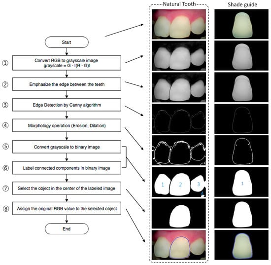 Figure 3 shows the edge detection procedure to select the shade guide. Although the 3D shade guide was used in this study as a sample to estimate our proposed scheme, the edge detection procedure was considered for real teeth in the clinic. By using the developed device, an image that contains several teeth was obtained as shown in Figure 3. Because the clinic will analyze the patient’s tooth, a process was performed to extract only the central tooth among several teeth. First, the tooth area was differentiated from the gum area by using the formula “grayscale = G − |(R − G)|”. Because the R value of the gum was greater than the R value of the tooth and the G value of the gum was similar to the G value of the tooth, the color difference between the R and G values could be used to convert the image to reveal the tooth area. Then, the edge of each tooth was emphasized by applying a 10 × 20 “Canny mask” and morphology algorithms, such as “erosion” and “dilation.” The grayscale image was converted again to a binary image with a threshold set by the mean value of the grayscale for the edge area. From the binary image, each tooth was distinguished by applying the “labeling” algorithm. The proposed edge detection procedure was also well-applied to emphasize the shade guide from the background. After edge detection of the shade guide, the mean color value was extracted and analyzed.