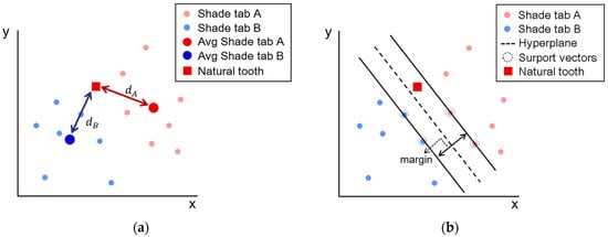 An SVM is a supervised learning model with an associated learning algorithm that analyzes data used for classification analysis [,,]. Because classification among color groups of neighboring shade tabs is important for a shade-matching application, shade-matching by using an SVM algorithm may be an optimum solution for suitable shade tab matching with high accuracy. For comparison, shade matching by using the Euclidean distance between representative colors of shade tabs in the database and the measured color was also performed.