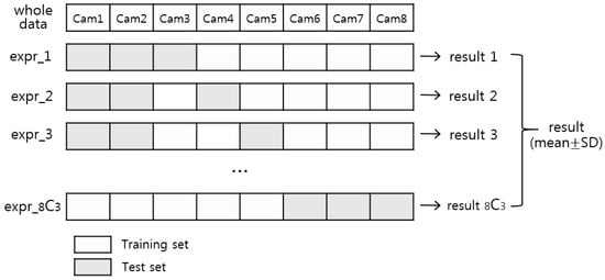 In addition, the performance of the SVM algorithm and other classification algorithms was evaluated using the LPOCV method. Figure 5 shows the schematic view of the method. In the eight device datasets, three device datasets were assigned as validation sets and the remaining datasets were assigned as training sets. Then, the color matching process was performed based on the classification models in the training sets. This process was repeated for all possible combinations that divided all datasets into training and validation sets, and the accuracy and reliability of the proposed scheme were analyzed.