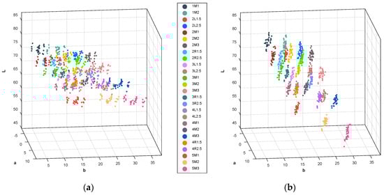 To organize a database, 26 shade tabs of the 3D, from 1M1 to 5M3, were measured seven times by using five devices such that a total of 35 color information sets for each shade tab were obtained. Figure 6 shows the mean colors of the 3D measured by the developed digital shade-matching device in the CIEL*a*b* color space. As described in the previous section, color correction was performed by the 3 × 3 CCM after measurement of the tooth image. The effect of color correction is shown in Figure 6a,b (see Supplementary Materials, Videos S1 and S2). The measured color group for each shade tab was more consistently separated from the neighboring group after color correction.