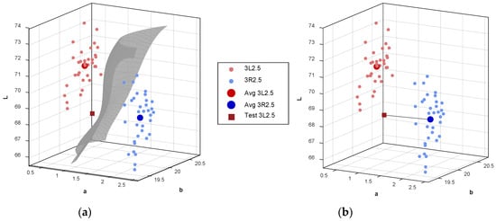Figure 7 shows the measured colors for the two shade tabs 3L2.5 and 3R2.5. The small red and blue circles represent the 35 measurements of the mean colors of 3L2.5 and 3R2.5, respectively (see Supplementary Materials, Video S3). The large red and blue circles denote the averaged color of their mean color group. The red square is the mean color of 3L2.5 measured by an additional device that was not used for organizing the database. From the measured colors, a two-dimensional hyperplane for SVM could be obtained as shown in Figure 7a. Based on the hyperplane, the colors on the left side were corrected to 3L2.5 such that the measured test color could be well-determined to be 3L2.5. However, the Euclidean distance between the measured test color and the averaged color of 3R2.5 was smaller than the Euclidean distance between the measured test color and the averaged color value of 3L2.5 as shown in Figure 7b–e. In this case, the measured test color was decided to be 3R2.5 by the Euclidean distance.