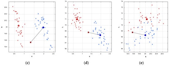 Colors 3L2.5 and 3R2.5 of the 3D shade tab measured by the developed digital shade-matching device in the CIEL*a*b* color space: (a) two-dimensional hyperplane; (b) Euclidean distance in the three-dimensional color space; (c–e) Euclidean distance in the two-dimensional color space of the a*b*, L*a*, and L*b* axis. (Small red and blue circles: mean colors of 3L2.5 and 3R2.5 in the database; large red and blue circles: averaged color of the mean color group in the database; red square: mean color of 3L2.5 measured additionally for testing).
