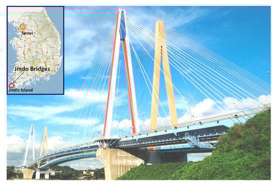 Bayesian model updating is performed for the Jindo Bridge, which is a twin cable-stayed bridge in South Korea, as shown in Figure 1. The bridge on the left is investigated in this study because of the availability of the measured structural responses. The bridge has a 344-m main span and two 70-m side spans.