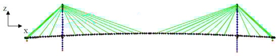 The corresponding FE model of the bridge is demonstrated in Figure 2, which is constructed based on the available drawings and design documents using a MATLAB-based toolbox [30]. The toolbox was originally used to create the FE models for the benchmark control problems for seismic response of cable-stayed bridges [31,32]. The FE model consists of 641 nodes, 238 beam elements, 68 cable elements, 394 rigid links, and 641 lumped masses. In the model, deck-to-pylon connections are modeled using pin and roller supports. Analytical modal parameters including natural frequencies and mode shapes of the first 14 modes, including nine vertical, four lateral and one torsional vibration modes can be extracted from the bridge FE model as the simulated data for Bayesian FE model updating. These 14 modes are also the modes identified using response measurements from the field deployment, which will be described in Section 3.4.
