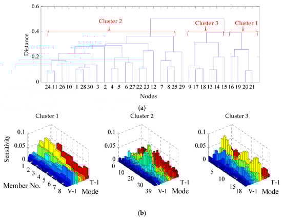 (a) Hierarchical binary tree for mass sensitivities; (b) Sensitivity matrices of mass clusters. The “Mode” axis indicates the first 9 vertical, 4 lateral and 1 torsional modes.