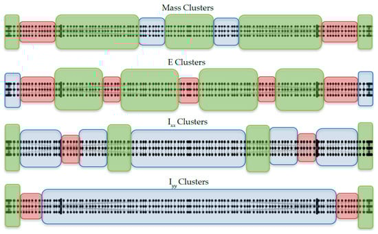 By performing separate clustering, three clusters for each type of physical parameters including mass, Young’s moduli, Ixx (moment of inertia in x-direction), and Iyy (moment of inertia in y-direction) and thereby 12 clusters in total are obtained. The binary tree to the three mass clusters is shown in Figure 3a. Figure 3b shows the sensitivity matrices of the three mass clusters. Note that clustering is based on the cosine distance of the sensitivity vectors with respect to 14 modes; the parameters within the same cluster show similar sensitivity to these modes on an average sense. As mentioned previously, individual mass parameters are assigned to the beam elements of half of the bridge girder, leading to 65 parameters for mass. In this figure, the x axis refers to these mass parameter numbers. The grouping results from the cluster analysis are presented in Figure 4 by showing the physical locations of each parameter group using different colors.