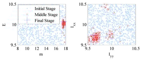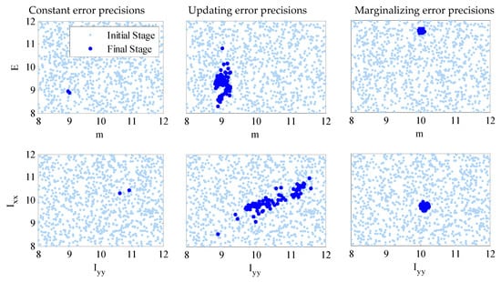 In Figure 5, the results of TMCMC samples of the structural model parameters in the first and last stages of TMCMC are demonstrated, which show how the samples converge from the prior to the posterior as the tempering parameter increases from 0 to 1. In this numerical investigation, about 20 stages were needed to achieve convergence. Compared with the case with error precisions updated, the samples are much more concentrated in the final stage for the case with the error precisions marginalized, indicating much higher identification confidence. The reason is presumably that the model parameters are much more sensitive to the prediction-error precisions and than their corresponding hyper-parameters and This is consistent with our discussion in Section 2.4. However, for the case with constant precisions, the samples of Iyy versus Ixx at the last stage are even more concentrated, though at two incorrect locations. This is due to the fact that the uncertainties of the prediction-error precision parameters have been overlooked by estimating them directly, which leads to inaccuracy in the model updating results and underestimation of the posterior uncertainties of structural model parameters, as we discussed in Section 2.4.