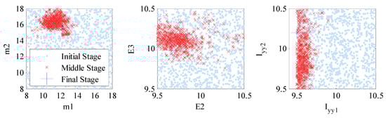 Plot of samples in the structural model parameter space generated at the initial, middle and final stages of TMCMC for model class
