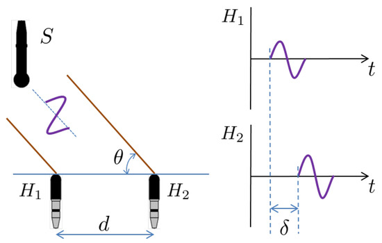 The proposed method uses a marine vehicle equipped with two hydrophones to estimate the directional angle of an underwater acoustic source. Figure 1 shows the principle of the proposed TDOA-based direction estimation method. When a source transmits an acoustic signal, two hydrophones receive the same signal separated by a time delay (). Assuming planar far-field propagation of the acoustic wave, the direction of the acoustic source () can be acquired as