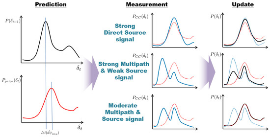 Illustration of time delay probability calculation. The black and red lines in the prediction step represent the probability at time step and the predicted prior probability calculated by the angular displacement of the marine vehicle at time step t, respectively. In the measurement and update steps, the red lines represent prior probability, the blue lines represent the cross-correlation function, and the black lines represent the calculated time delay probability at time step t.
