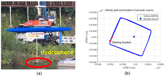 Experimental setup: (a) USV equipped with two hydrophones; and (b) vehicle path and location of acoustic source acquired from DGPS.