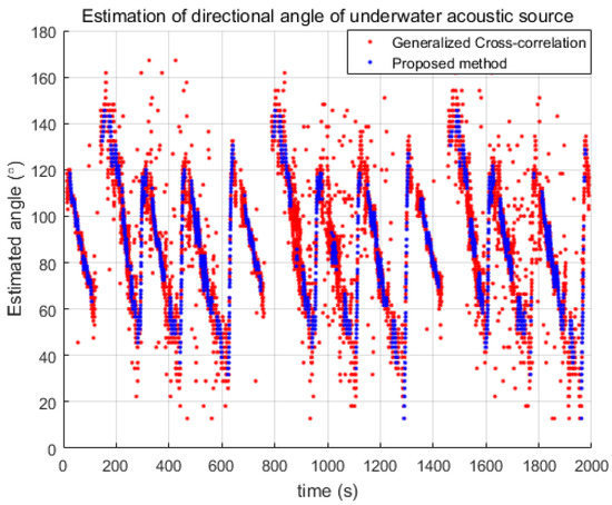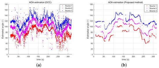 Figure 8 provides the estimated directional angles of the three underwater acoustic sources using the GCC and proposed methods. Figure 8a shows that the experimental result from GCC involves many outliers, so the estimated directional angles are very noisy. The proposed probabilistic estimation of the directional angles filtered out these noisy data and provided a reliable result, as shown in Figure 8b.