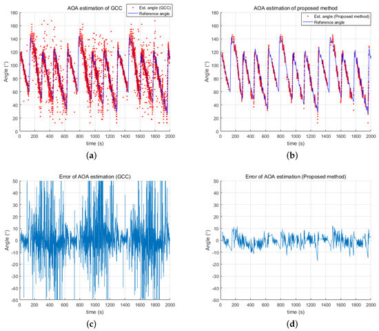 Figure 6 provides the accuracy of the proposed method by comparing the reference angles, considered to be the correct values, acquired from the DGPS location of the acoustic source and from the location and the heading of the USV, acquired from DGPS and magnetic compass readings. In Figure 6a,b, the blue line represents the reference angle and the red dots represent the angle estimated by the GCC and the proposed method, respectively. As shown in Figure 6b, the angles estimated by the proposed method fit the reference angles well. The error between the reference angles and the estimated angles is shown in Figure 6d to have been maintained within for most cases. On the other hand, the GCC produced much larger errors, as shown in Figure 6c, due to the outliers. These results demonstrate the robustness and accuracy of the proposed method over the conventional GCC method.