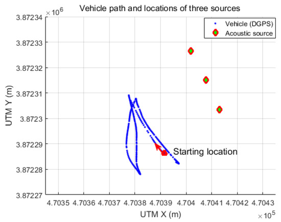 Vehicle path and locations of three acoustic sources acquired from DGPS.