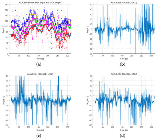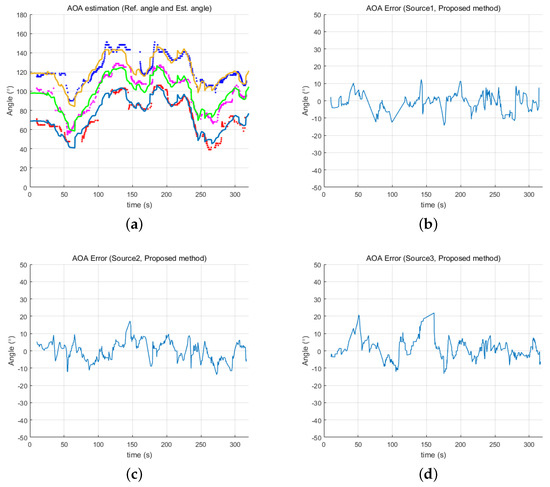 Error of angles determined by the proposed method: (a) reference angles and estimated angles of three acoustic sources from the proposed method; (b) error of Source 1; (c) error of Source 2; and (d) error of Source 3.