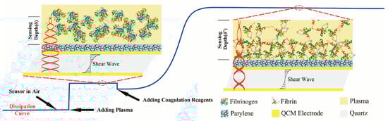 QCM sensor is quite sensitive to the viscoelastic change of blood sample when blood coagulates and dissipation is the key factor and effective parameter to reflect this kind of transformation. QCM sensor can only probe the region very close to the interface since the shear wave decays rapidly in the liquid environment. The sensing depth of the QCM sensor can be described as [35]