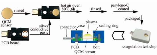 Each QCM sensor was packaged as a coagulation test chip. The steps we took were shown in Figure 4. First, the QCM sensor was rinsed by ethyl alcohol, hydrogen peroxide and deionized water sequentially and dried by nitrogen. Second, the QCM sensor was bonded on a print circuit board (PCB) with silver conductive paste and the component was kept in a hot-air oven with temperature controlled at 80 °C for 6 h until the silver paste was all hardened. Finally, the sensor component was rinsed by ethyl alcohol, hydrogen peroxide and deionized water sequentially, dried by nitrogen.