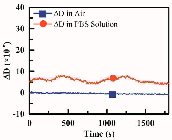 The stability evaluation results were shown in Figure 6, Variations of 1 × 10−6 in the air and 2.5 × 10−6 in the PBS solution could be observed. This verified that the device was qualified for coagulation test since the dissipation change during coagulation was much more than 2.5 × 10−6.