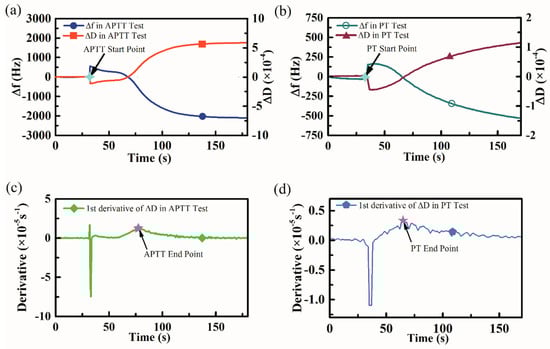 Figure 7. Typical frequency and dissipation signals during blood coagulation, all data were recorded by a smartphone. (a) Typical frequency and dissipation curves during activated partial thromboplastin time (APTT) measurements and the APTT start point was considered as the moment when APTT activator was added. (b) Typical frequency and dissipation curves during PT measurements and the PT start point was considered as the moment when PT reagent was added. (c) The first-order derivative of APTT dissipation curve and the peak point was regarded as the APTT end point. (d) The first-order of PT dissipation curve and the peak point was regarded as the PT end point.