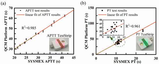 Figure 8. QCM coagulation testing platform results. (a) Comparison of twelve APTT measurements between the testing platform and CS-5100 hemostasis system. (b) Comparison of PT measurements between the testing platform and CS-5100 hemostasis system.