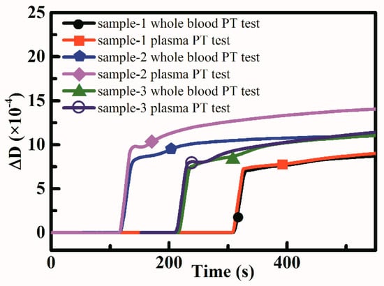 Three samples from healthy donors were used to perform whole blood based PT tests and plasma based PT tests. The QCM dissipation change curve result was shown in Figure 10 and the PT results calculated was shown in Table 1. Whole blood based PT tests showed close results compared to plasma based PT tests, which showed the possibility to measure coagulation function using whole blood.