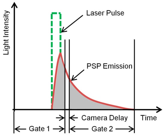 The single-shot method is based on the self-referencing of PSP images that are recorded after a single shot of high-intensity laser illumination. The technique (Figure 2) comprises two exposures: represents the intensity captured during Gate 1 of a CCD camera; it integrates the initial pressure-insensitive light emission from the PSP () and serves as reference for the long, open-ended pressure-sensitive Gate 2 (), which picks up the photons emitted during the lifetime decay of luminophores from their excited state (represented as ). CCD cameras have an inherent time delay between the two gates, which leads to a loss in captured intensity (). The exposure duration of Gate 1 may be adjusted on a double-framed camera to balance the light intensity in both gates at ambient conditions, capturing maximum pressure sensitivity while minimizing the effects of imager shot noise. A wind-off reference ratio with same imager setting is mapped to the wind-on ratio to further eliminate the spatial variation with the resulting ratio-of-ratios used in the modified Stern–Volmer equation: