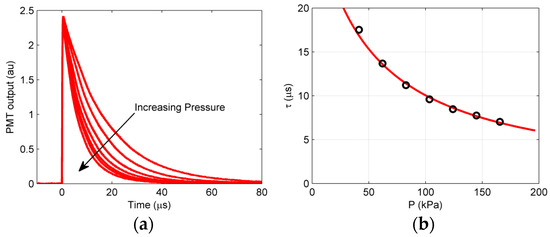 Measured lifetime decay curves (a) and corresponding lifetime calibration values (b) for polymer-ceramic (PC)-PSP with PtTFPP (adapted from Gregory et al. [8]).