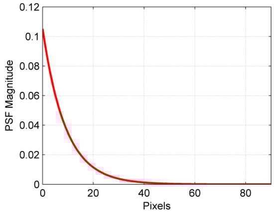 where ei is the ith unit vector consisting of all of the zeros with 1 only at the ith location. For our column-wise one-dimensional blur, the ith column of K contains the PSF of the ith pixel that starts from the main diagonal and contains the weights that describe how its intensity affects the pixels below it. If the pressure value at a point is known, as is the case for a non-blind deconvolution problem, the PSF can be constructed using the information about lifetime curves, rotation frequency, sub-pixel resolution in the circumferential direction, and the exposure period [8]. A typical normalized point spread function for atmospheric pressure with a rotational speed of 269 Hz and an angular resolution of 0.1/pixel is shown in Figure 4. The lengths of the PSFs were extended over 10 lifetimes at every pressure beyond which the intensity was assumed to be negligible; the resulting PSF was then normalized. This process was automated with a MATLAB function that readily generates the PSF vector when provided with appropriate inputs for a pixel-to-pixel spatially variant kernel.