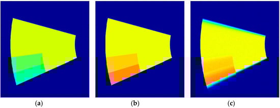 Samples of the forward-modeled sharp and blurred images used in this work are shown in Figure 5. For generating these, an image of a wedge-shaped region of PSP on a spinning disk is represented by pixels that have a value of 1 inside the paint, and 0 otherwise. This was used to represent the total luminescence intensity that each point on a uniform PSP disk emits after a single shot of pulsed laser. Depending on the pressure experienced, the lifetime of emission at each point varies and gets split into the two gates of the single-shot method, as described earlier. Three regions of pressures were selected in this elementary image—70 kPa (outer part of the leading edge), 90 kPa (the middle patch), and 110 kPa (remainder of the disk)—which produce the sharp Gate 1 and Gate 2 images, as shown in Figure 5a,b, respectively. It can be observed that depending on the pressure, the intensity of the regions is different, as captured in Gate 1 and Gate 2 images. To simulate anticlockwise rotation at 269 Hz, the three separate patches of the sharp Gate 2 image were then blurred separately as described earlier, and then superposed to form the blurred Gate 2 image. This high-definition blurred Gate 2 image (3000 × 4000) was then downsampled (600 × 800) to model the discretization error, and 4% noise was added to obtain the test image, as shown in Figure 5c.