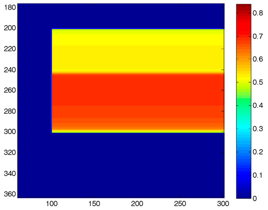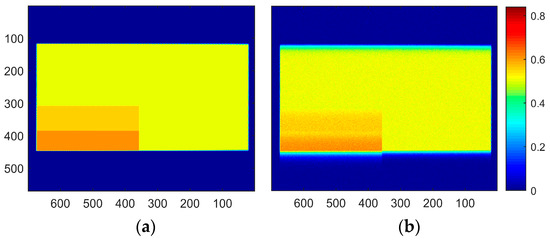 The index for stopping the iterations acts as the regularization parameter by defining the size of the singular values that are to be neglected. Since the SNR in PSP images is subject to huge variations, it can be experimentally determined and set in the initialization step, and then the same value is used in the subsequent iterations to ensure automation. The choice of iterative method was made by its applicability to the blind iterative scheme developed here. Although Krylov subspace-based methods—such as the conjugate gradient method for least squares (CGLS) or the bidiagonalization-based least squares (LSQR)—converge very quickly, they also exhibit a sharp increase in noise amplification after achieving this semi-convergence [42,45]. On the other hand, Richardson iterations being inherently slow are also significantly gradual in reconstructing higher frequency detail, and thus, the amplified noise dominates the reconstructions at a much slower rate. Since this work uses a preset value for the regularization parameter, which might not be accurate over all of the iterations, it is prudent to use a method that does not exhibit sharp amplification of noise after achieving the semi-convergence, especially while using it with a low SNR experiment. Consequently, every iteration of the blind deconvolution scheme employs the steepest descent implementation of the Richardson method. More about this classical iterative method and how it can be interpreted as SVD filtering is described by Berisha and Nagy [25], along with the MATLAB notes on its implementation.